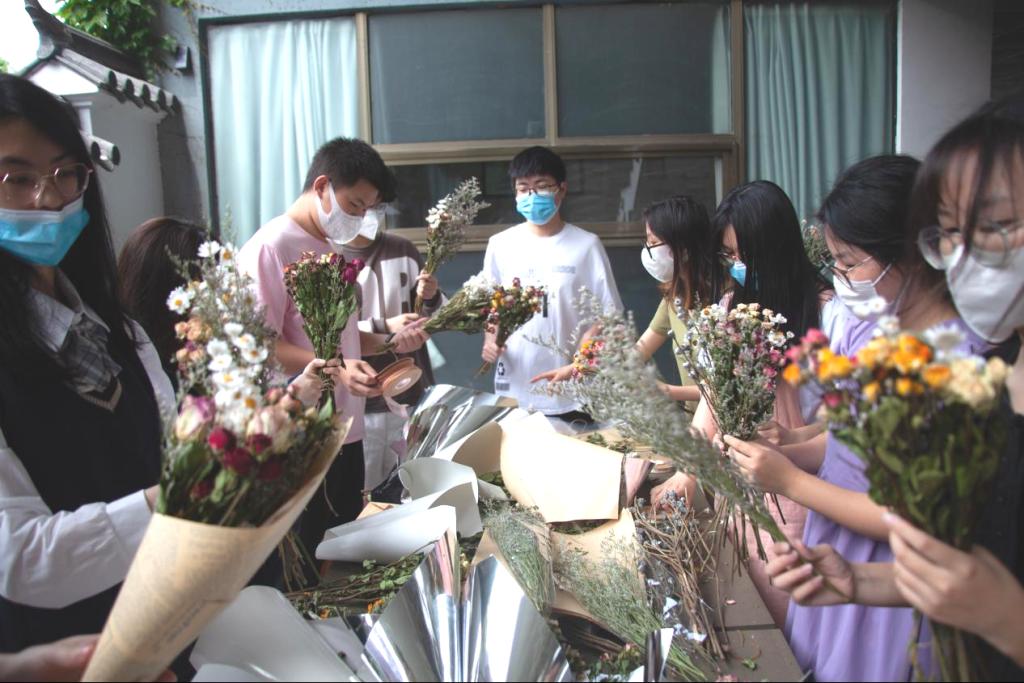 “第一次亲手为妈妈做一束花,让这份祝福变得更加有意义”,来自建筑工程技术1班的男生如是说。师生们精选挑选干花,进行搭配、修剪、包装、美化,在短短的一小时内共同完成了30份干花花束。作品完成后,有的同学将花束快递给远在家乡的母亲,有的同学将花束送给自己的班主任,在这个特殊的日子里传递属于自己私人定制的爱。