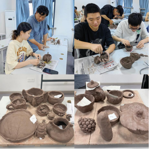 俞永民老师首先讲述了他从事陶艺的心路历程,一次次失败的制陶经历造就了他的耐心和匠心。随后俞老师介绍了各种各样富有特色的陶制工艺品,讲解了制陶七步骤并现场进行了捏压、团圆、雕刻等技能的演示。接下来是手捏成型法的动手制作环节,在俞老师的指导下,同学们快速上手,充分发挥想象力,制作了盘子、茶杯,花瓶、小碗等等,完成了属于自己独一无二的作品。