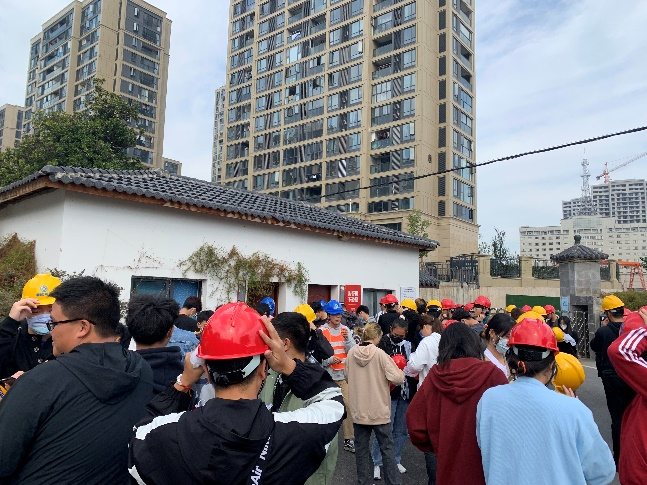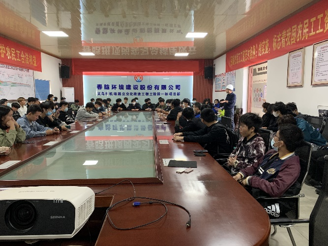 到达义乌市机场路立交化改造工程三阶段项目部后,项目总工杨栋、项目技术负责人王斌峰分别介绍了施工项目的概况和工地安全要求等情况后,给学生发放了安全帽,并指导学生如何佩戴。